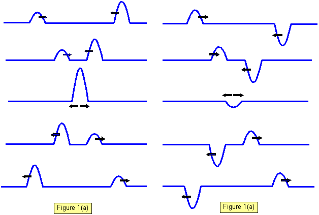 When two waves overlap the resulting disturbance is simply the sum of the disturbances produced by each wave. Imagine two waves moving towards each other as shown in Figure 1. Figure 1(a) shows two pulses of the same phase while Figure 1(b) shows two pulses of opposite phase.